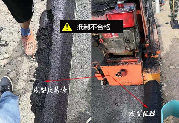 影響攔水帶正常成型的大多數原因都出現瀝青砂的配比上面。做瀝青砂攔水帶是不能使用公路攤鋪的瀝青砂的。而且對瀝青砂中瀝青油的配比不能過高。一般情況下瀝青油的配比控制在6%左右,最大不能超過7.5%。
